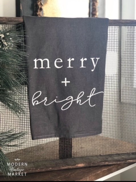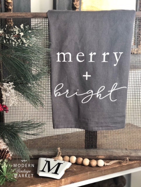 Just in time to update your Christmas decor our chic and fabulous Merry + Bright design. Printed in white on our gray 100% cotton large flour sack towel. Large enough for all dishes and simple design will make a great kitchen staple. Absorbent 100% cotton dries dishes quickly and holds up to wash after wash.